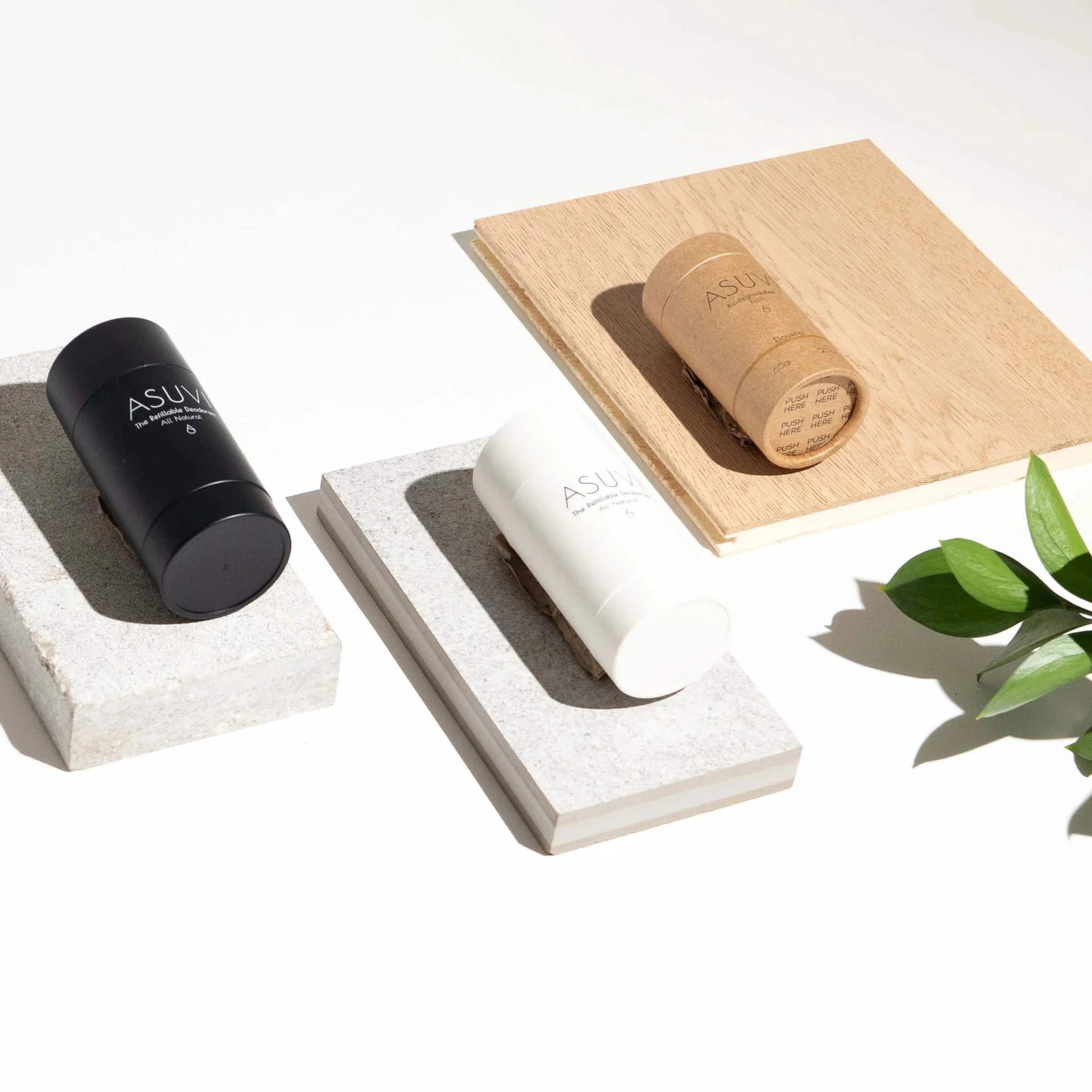 Available in White or Black, the reusable tubes are made from 100% post-consumer recycled plastic. Once finishes, the refills come in a variety of scents and biodegradable packaging, a world first for deodorants!